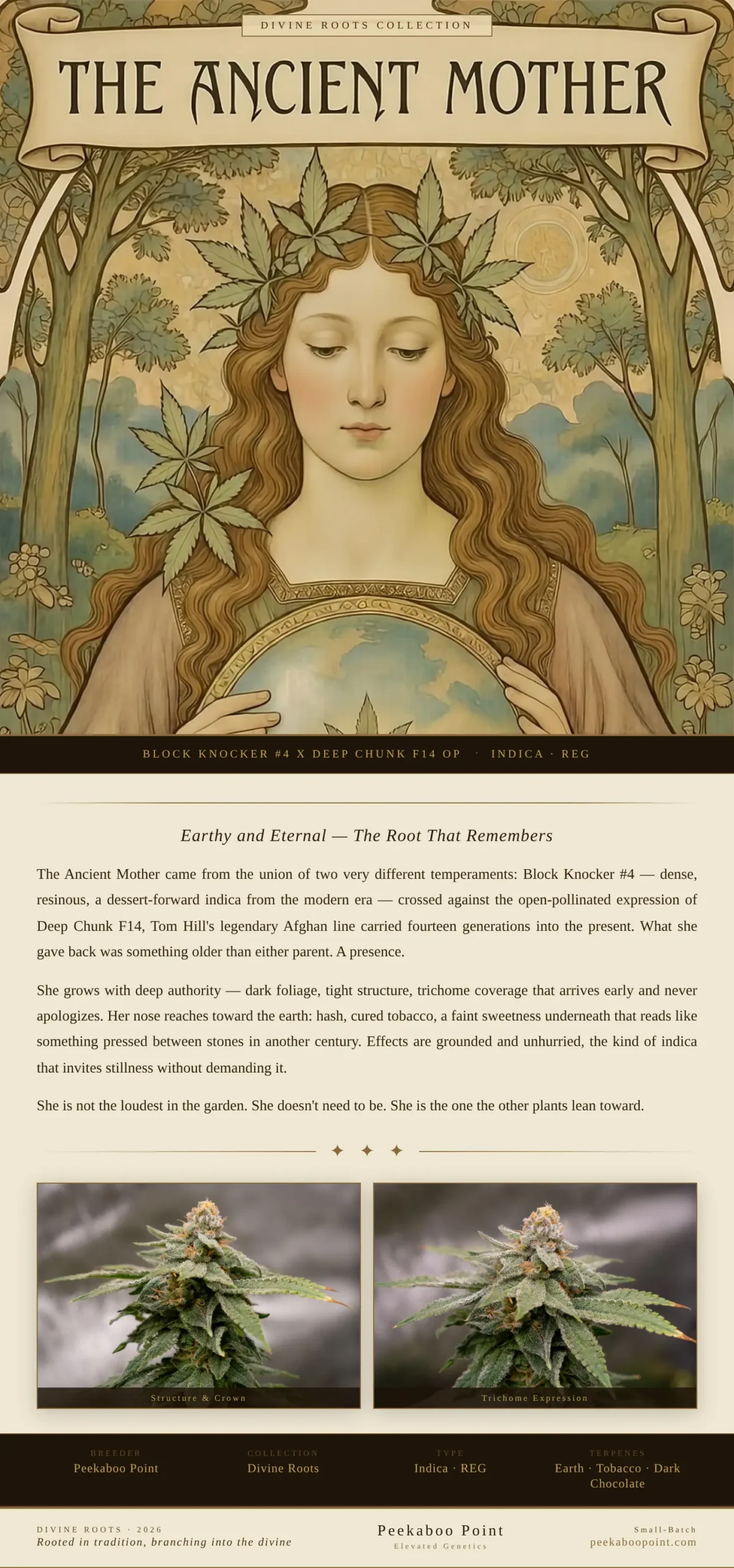 The Ancient Mother earns its name through depth rather than drama. Block Knocker brings one of the more intricate modern hybrid lineages in the catalog — Ice Cream Man and Grape Sundae on the mother side, Lucky Charms (The White × Appalachia) on the father side — and all of it runs straight into fourteen generations of Deep Chunk IBL. The result is a strain built around restraint. Creamy, nutty, doughy. A profile that doesn't announce itself so much as settle into the room and stay.