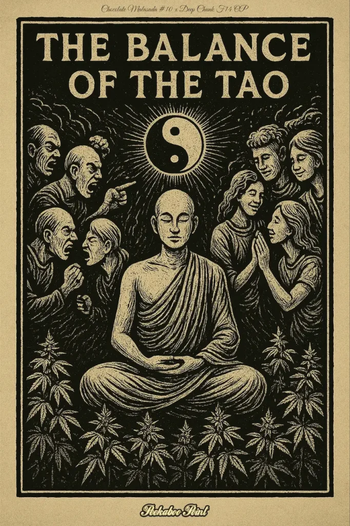 The Balance of the Tao (Peekaboo Point) unites Original Glue × Kauai Mints with a Deep Chunk F14 father—bringing together Chem/Diesel chocolate-fuel, tropical/Kauai brightness with GSC minty sweetness, and old-world Afghani hashplant weight. Flowering lands around 8–9 weeks (~56–63 days).