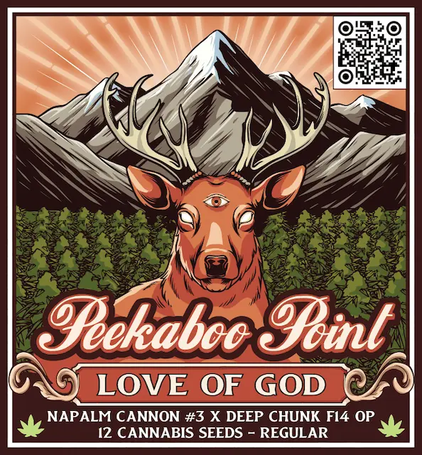 The Love of God (Peekaboo Point) brings together Napalm Cannon #3 (TerpFi3nd Genetics) and Deep Chunk F14 OP in a mostly-indica expression. Napalm Cannon contributes black-cherry incense and dessert-fuel depth, while Deep Chunk’s Afghan lineage ensures density, hash aroma, and meditative calm. Flowering completes in about 60 days, producing trichome-rich colas designed for presence and peace.